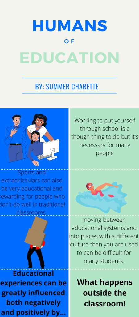 These artifacts from my time taking this course are telling of the different ways my skills as a writer can be put into use. The citations are to be expected of a writer but adding the annotations was helpful for extra practice in making sure my thoughts are clearly lined up before writing and that my research is actually helping defend my point of view. Making transcripts of an interview was a new experience for me and helped build my confidence in interviewing people and how to use excerpts from interviews in my writing. The infographic I made for my remix project was also new to me and taught me how to use images to convey an idea and how to get information across in a more condensed manner.